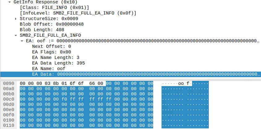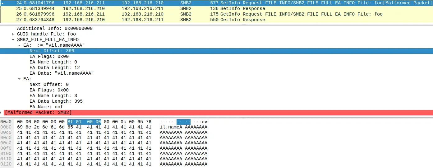 smb2_ea_info는 다수의 엔트리를 포함할 수 있는 구조체로, 그 내용은 공격자에 의해 제어될 수 있다. 구조체 내 NextEntryOffset 필드는 다음 엔트리까지의 상대적인 오프셋(offset)을 나타낸다.