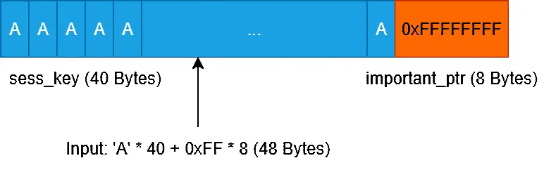 이때 공격자는 40바이트의 임의 데이터(예: 'A' * 40)와 8바이트의 특정 포인터 값(예: 0xffffffffffffffff)을 조합하여 총 48바이트 길이의 세션 키를 구성한다. 해당 세션 키를 서버로 전송하면, 데이터 복사 과정에서 40바이트만 저장할 수 있는 sess_key 버퍼에 48바이트 데이터가 복사된다. 결과적으로 sess_key 버퍼의 경계를 넘어 뒤따르는 important_pointer 필드의 값이 공격자가 의도한 8바이트 값으로 덮어써지는 현상이 발생한다.