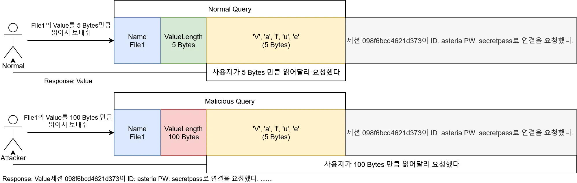 반면, 공격자는 동일한 'Value' 데이터에 대해 실제 크기를 초과하는 100바이트 읽기를 요청한다. 이때 서버가 요청된 길이를 데이터의 실제 크기와 비교하여 검증하지 않는다면, 'Value'의 경계를 넘어 인접한 메모리 영역의 95바이트를 추가로 읽게 된다. 결과적으로, 접근이 허용되지 않은 민감한 정보(예: 다른 세션의 연결 정보)가 포함된 100바이트의 데이터가 공격자에게 전송된다.