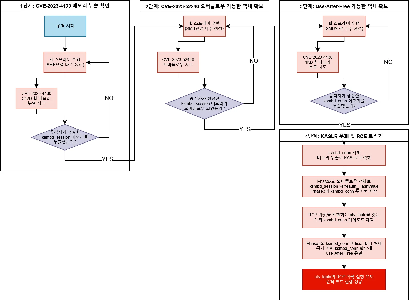 메모리 할당의 불확실성(Noise): 본 공격에 사용되는 512바이트 및 1KB 크기의 힙 청크(chunk)는 KSMBD 외 다른 커널 서비스에서도 빈번하게 사용된다. 이러한 메모리 할당 경쟁은 예측 불가능성을 높여 힙 스프레이나 Use-After-Free 기법의 실패 확률을 증가시킨다.