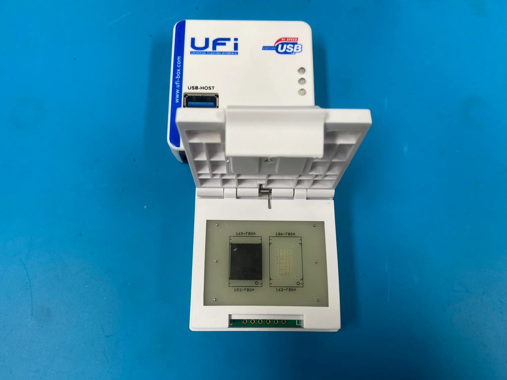 BeeProg2와 UFi가 리더기 역할을 하는 장비이며, 본체와 소켓으로 구성되어 있습니다. 현재 eMMC와 UFS 리더기와 그것과 호환되는 BGA 타입의 소켓을 구비하고 있으며, Chip-Off를 통해 기판으로부터 떼어낸 칩의 데이터를 해당 장비를 통해 추출할 수 있습니다.