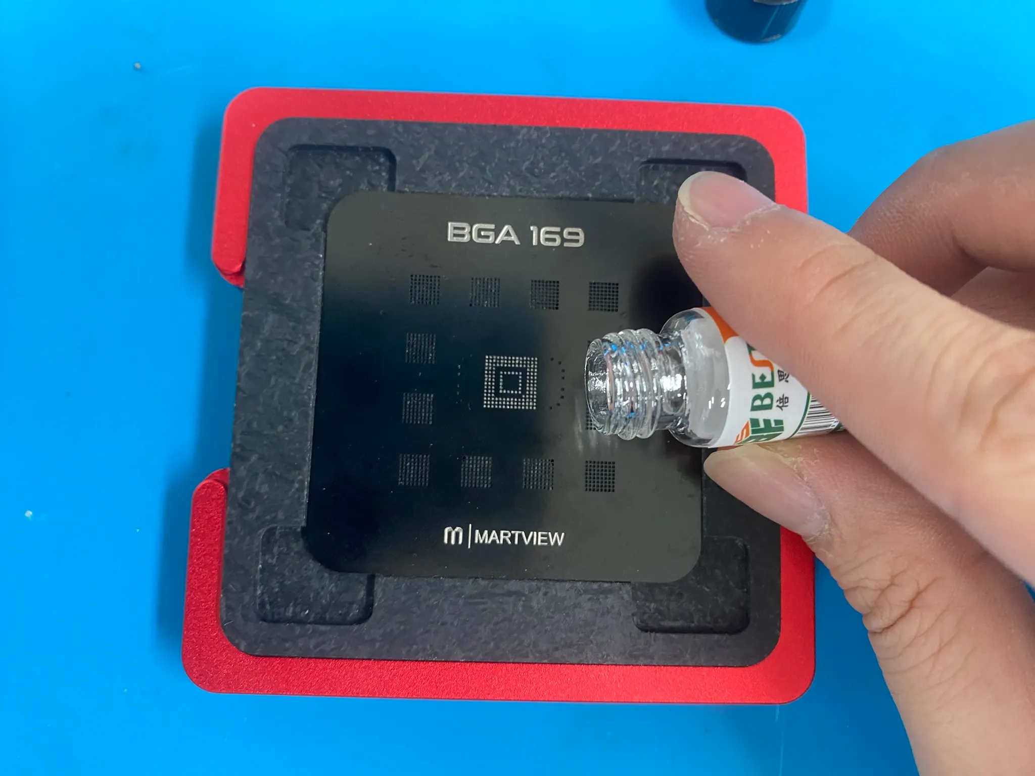 이 작업을 보다 편하게 하기 위해 지그와 스탠실을 사용합니다. 칩을 지그에 고정하고 칩의 규격에 스탠실을 맞춰 볼납을 뿌려주거나 크림납을 도포해 주면 간단하게 칩의 규격에 맞게 납을 올릴 수 있습니다. 그 후 열풍기나 예열기로 칩 위에 올라간 납을 녹여주면 납이 고정됩니다.