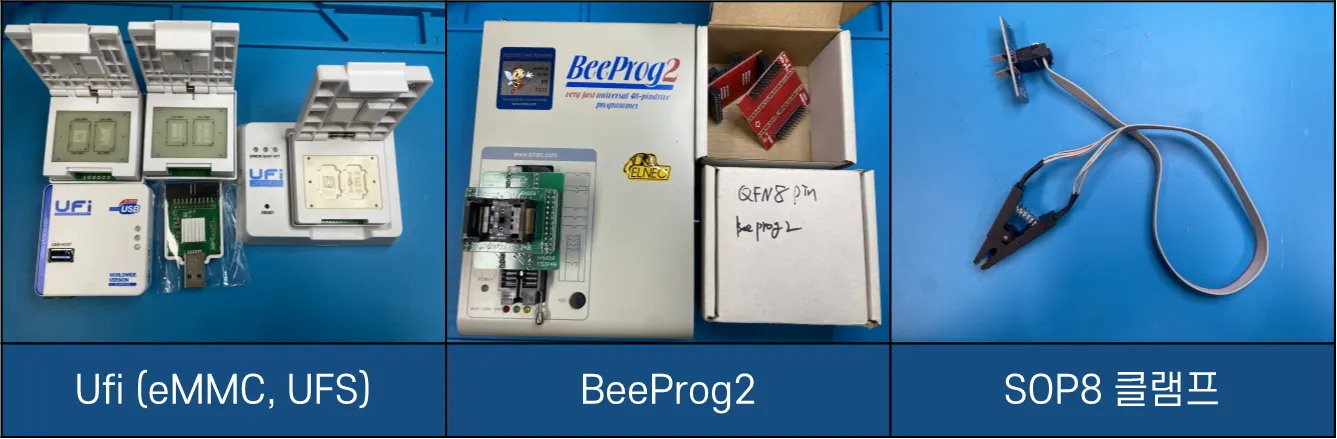 eMMC, UFS 등의 칩을 데이터 핀과 연결하기 위해서는 Chip-Off 작업이 필요하며, 칩을 읽을 수 있는 규격에 맞는 리더기가 필요합니다.
