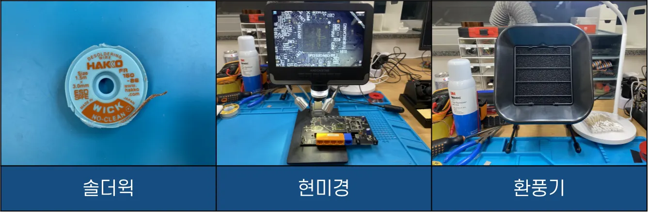 위 도구 외에도 하드웨어 작업 중 발생한 문제로 PCB 기판 상의 부품을 수리하거나, PCB 기판 상의 데이터 핀 부분을 연장하는 등에 사용하거나 작업자의 안전을 위한 도구 또한 준비가 되어있습니다.