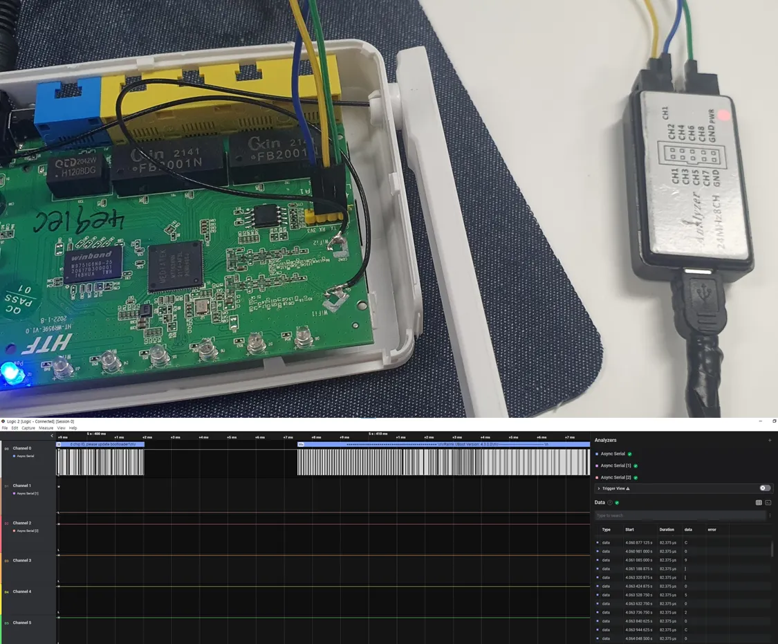 Logic Analyzer는 핀맵과 상관없이 연결하고 기기를 작동시키면 각 핀의 시그널 변화를 볼 수 있으며, 데이터 값과 클럭 주파수 등의 정보를 볼 수 있습니다. UART를 연결할 때 데이터 통신 단위인 Baud Rate를 맞춰주어야 하는데 이 수치 또한 Logic Analyzer로 알아낼 수 있습니다.